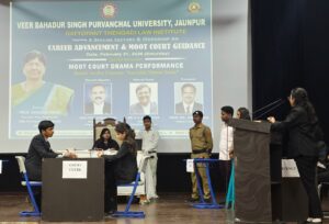 जौनपुर। वीर बहादुर सिंह पूर्वांचल विश्वविद्यालय के दत्तोपंत ठेंगड़ी विधि संस्थान में शनिवार को “करियर उन्नयन एवं मूट कोर्ट मार्गदर्शन” विषय पर विशेष व्याख्यान एवं कार्यशाला का आयोजन किया गया। कार्यक्रम का मुख्य आकर्षण वर्ष 2008 के बहुचर्चित आरुषि तलवार हत्याकांड पर आधारित आभासी न्यायालय (मूट कोर्ट) की नाट्य प्रस्तुति रही, जिसने उपस्थित लोगों को वास्तविक अदालत की कार्यवाही जैसा अनुभव कराया।