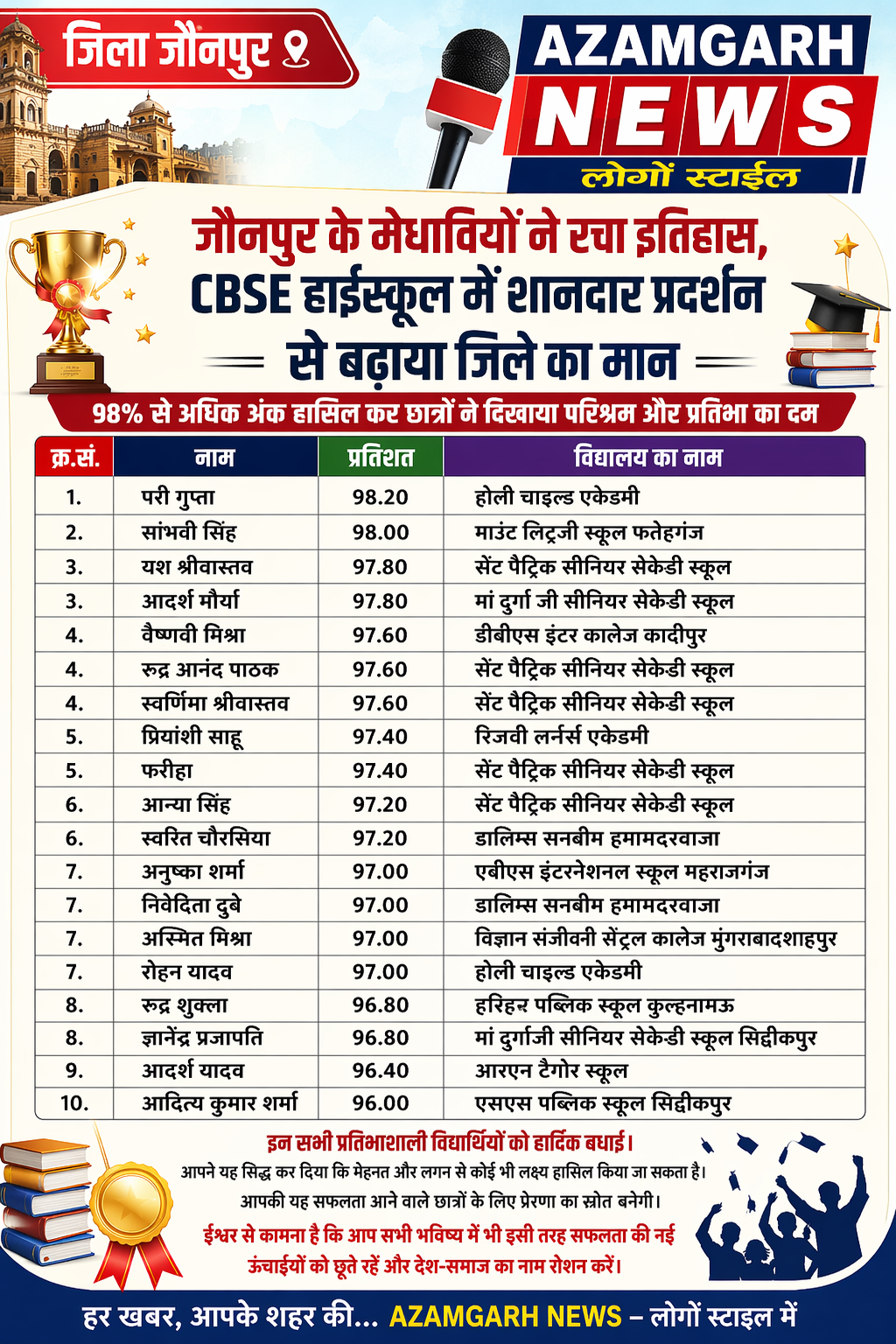 इस सूची में परी गुप्ता ने 98.20% अंक प्राप्त कर प्रथम स्थान हासिल किया, वहीं सांभवी सिंह ने 98.00% अंक के साथ दूसरा स्थान प्राप्त किया। 97% से अधिक अंक पाने वाले छात्रों की लंबी सूची यह दर्शाती है कि जौनपुर के विद्यार्थी शिक्षा के क्षेत्र में निरंतर नई ऊंचाइयों को छू रहे हैं।
