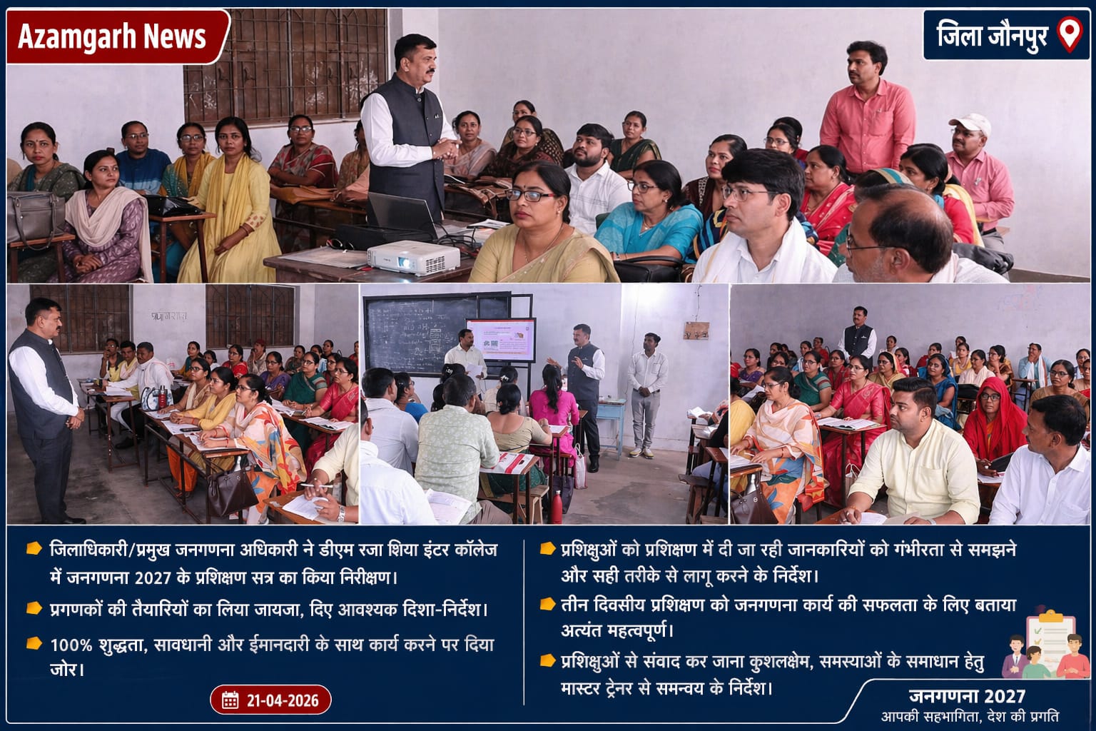 जौनपुर। मंगलवार को जिलाधिकारी डॉ दिनेश चंद्र एवं प्रमुख जनगणना अधिकारी ने डीएम रजा शिया इंटर कॉलेज में आयोजित जनगणना 2027 के प्रशिक्षण सत्र का औचक निरीक्षण किया। निरीक्षण के दौरान उन्होंने प्रशिक्षण प्राप्त कर रहे प्रगणकों की तैयारियों का बारीकी से जायजा लिया और उन्हें आवश्यक दिशा-निर्देश दिए।
